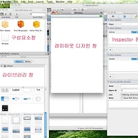 6. 그러면 아래와 같이 Interface Builder 라는 리소스 편집기 같은 것이 실행됩니다. 필자의 경우 아래 화면과 같이 3개의 창이 떴는데 좌측 창은 해당 리소스의 구성 요소, 가운데는 UI 디자인 창, 우측은 컨트롤 목록을 의미합니다. 나중에 빌드와 실행을 하게되면 iPod에 UI 디자인 창의 내용이 그대로 보여질 것입니다.